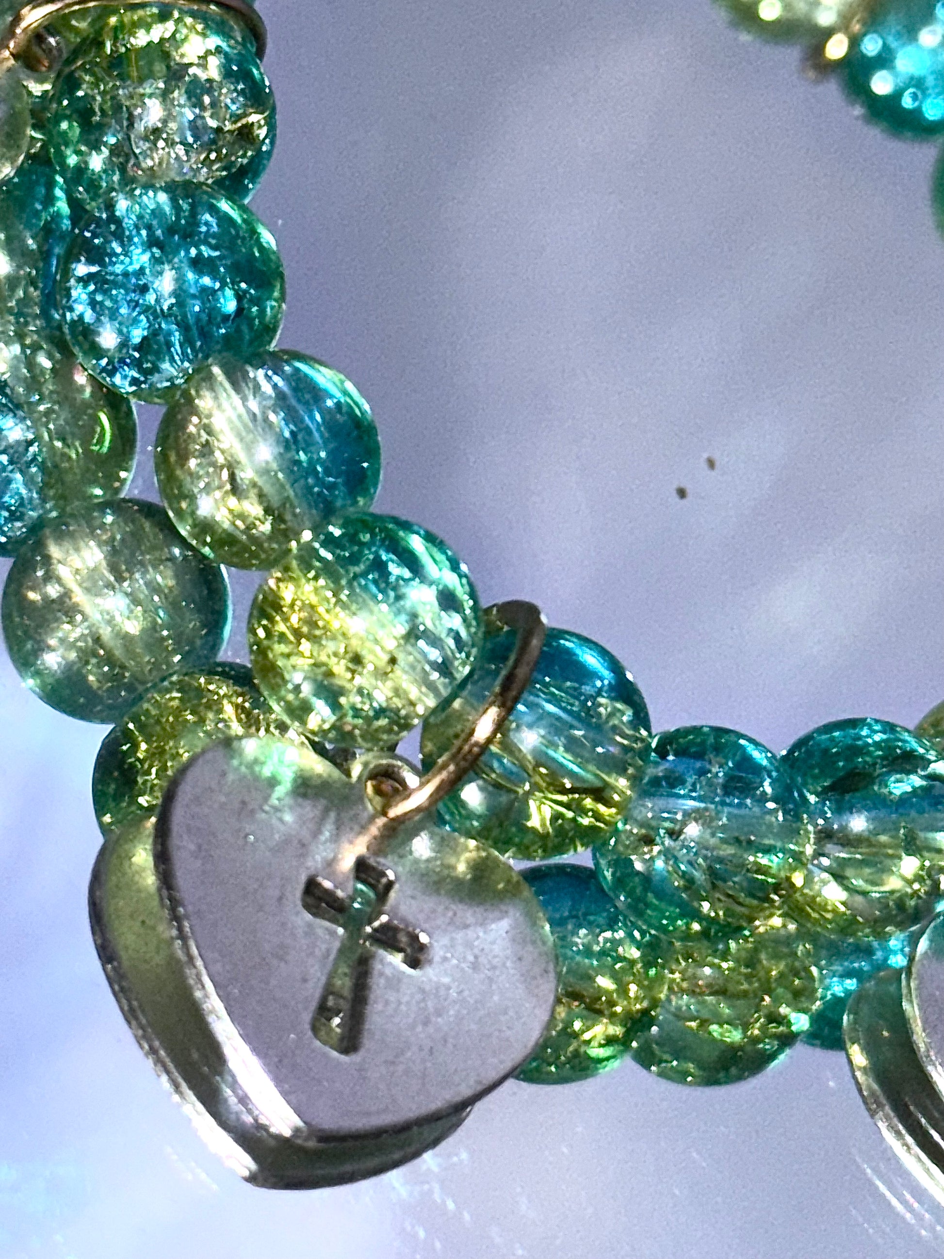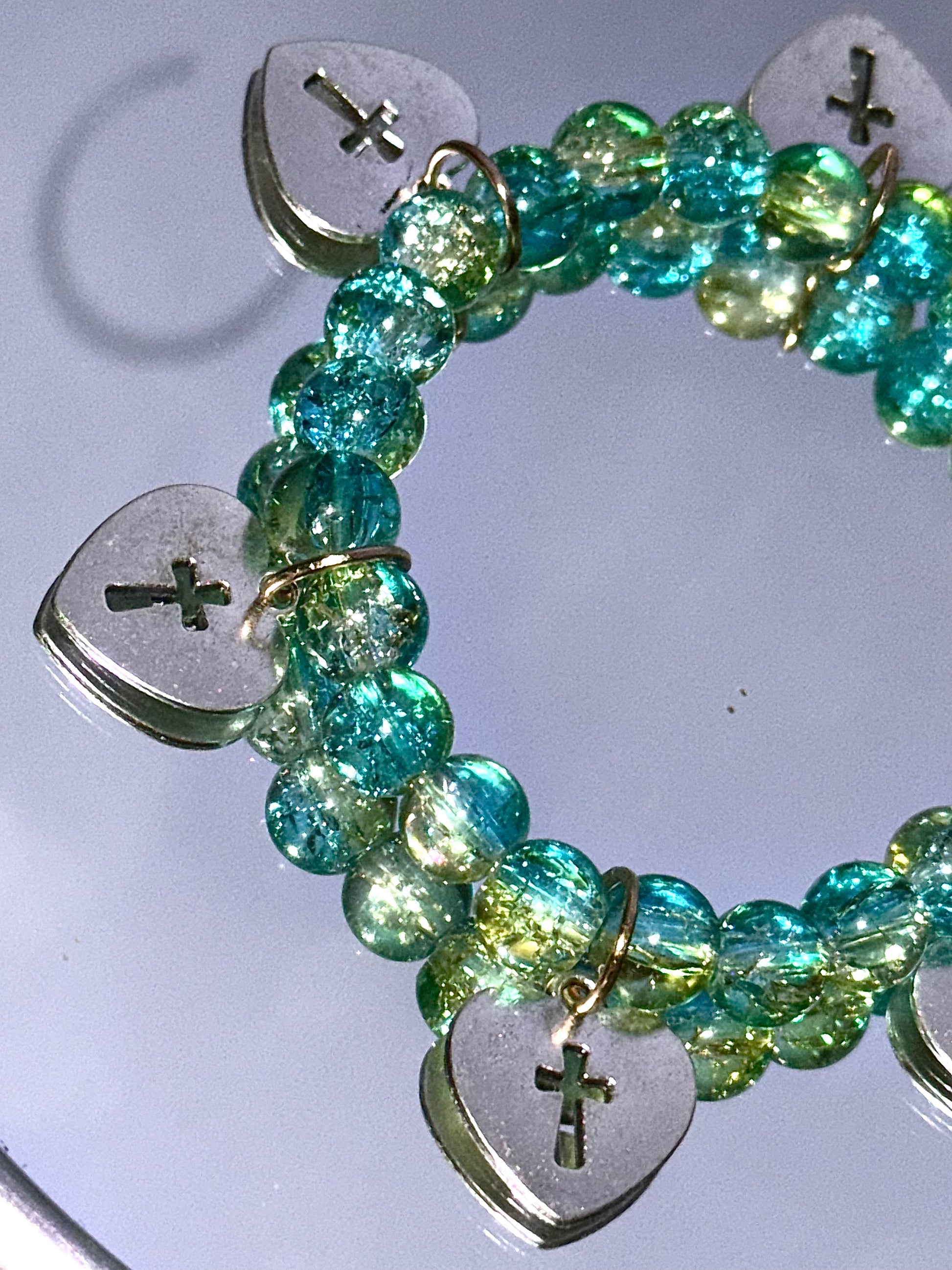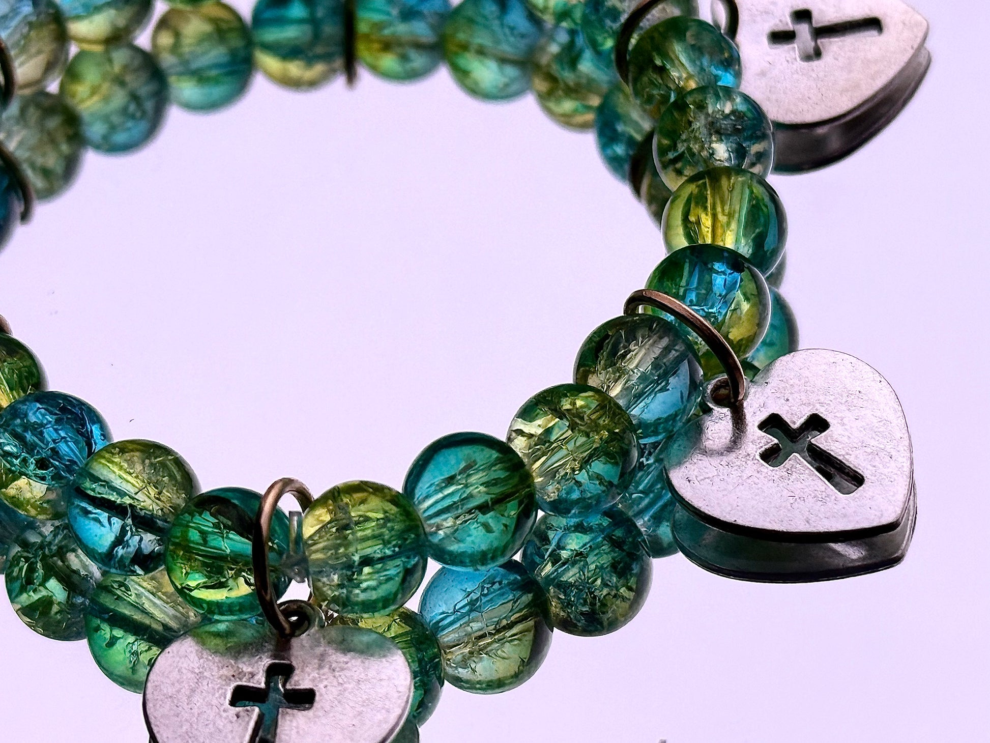 Inspired by 1 John 4:16 — “God is love. Whoever lives in love lives in God, and God in them.” The blue and green symbolize peace, growth, and spiritual renewal, while the heart-cross charms represent God’s abiding love and guidance. 🤍