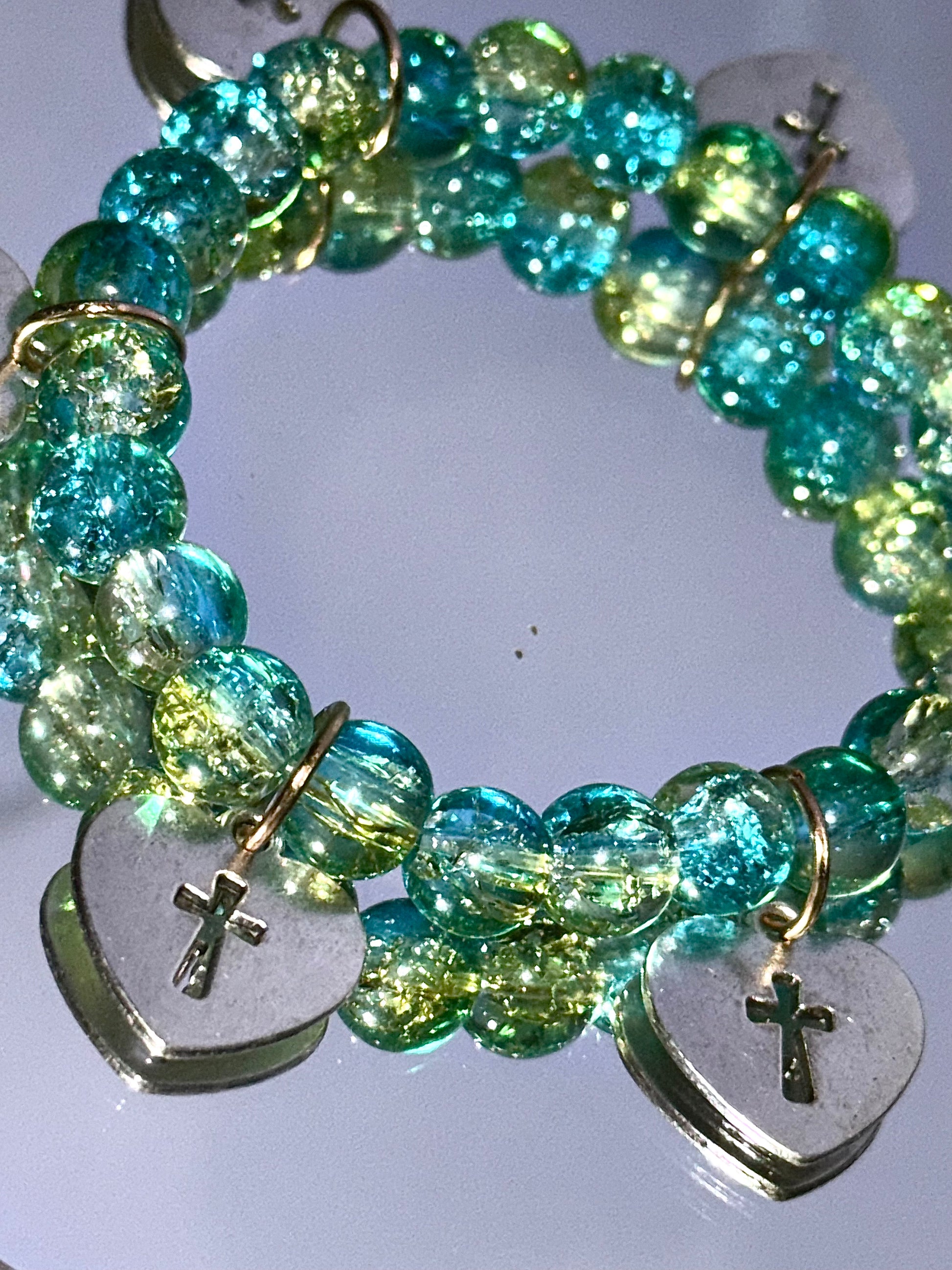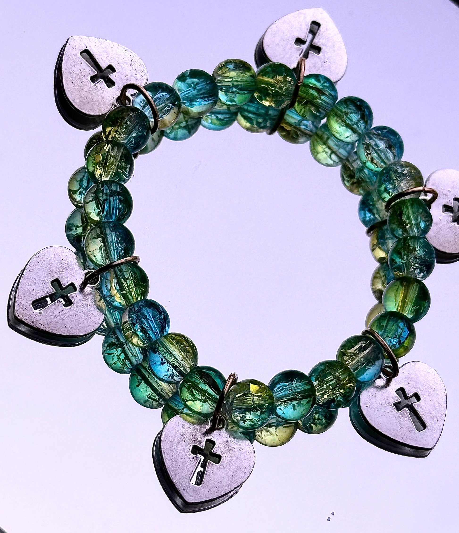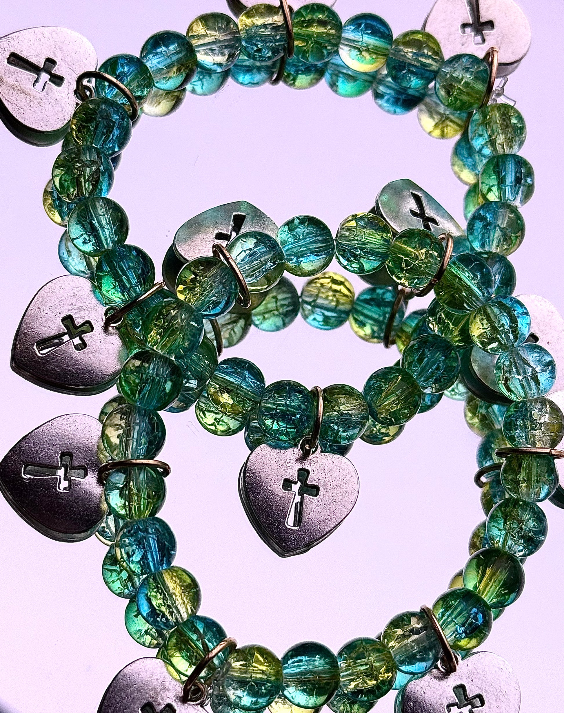 Inspired by 1 John 4:16 — “God is love. Whoever lives in love lives in God, and God in them.” The blue and green symbolize peace, growth, and spiritual renewal, while the heart-cross charms represent God’s abiding love and guidance. 🤍