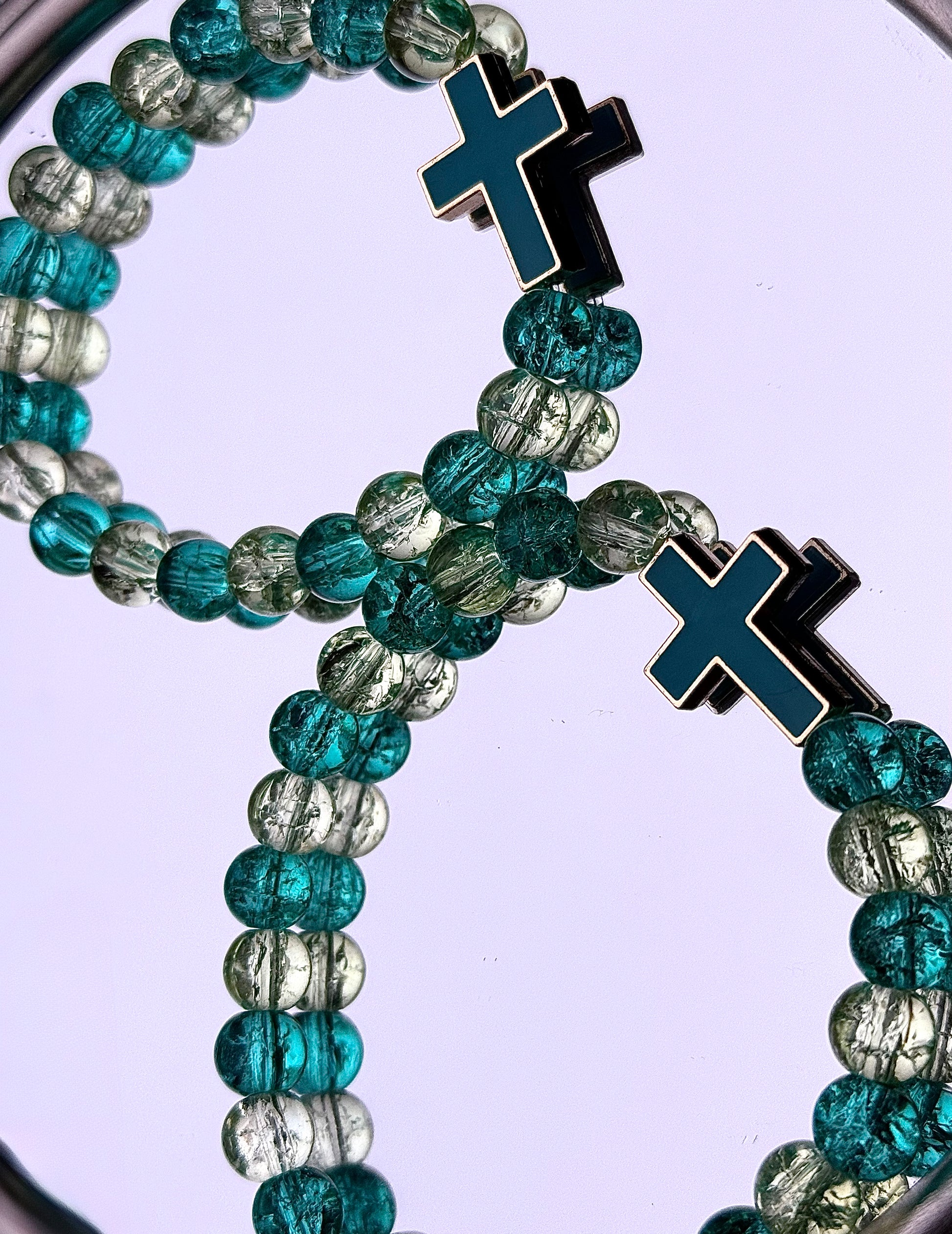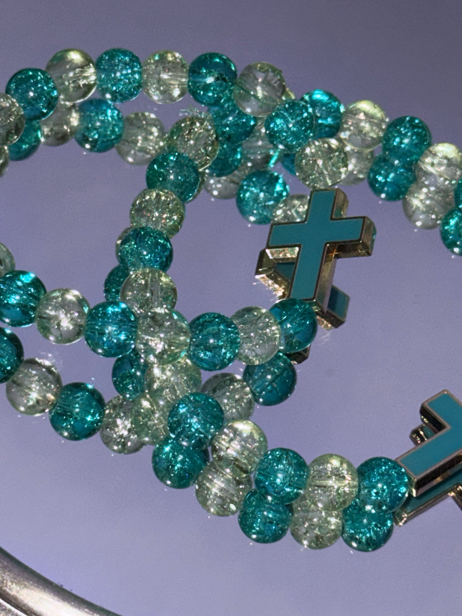 Inspired by John 4:14, where Jesus says, “Whoever drinks the water I give them will never thirst.” The turquoise color reflects calm, renewal, and spiritual refreshment, while the gold/cream beads symbolize purity and light. 🌊
